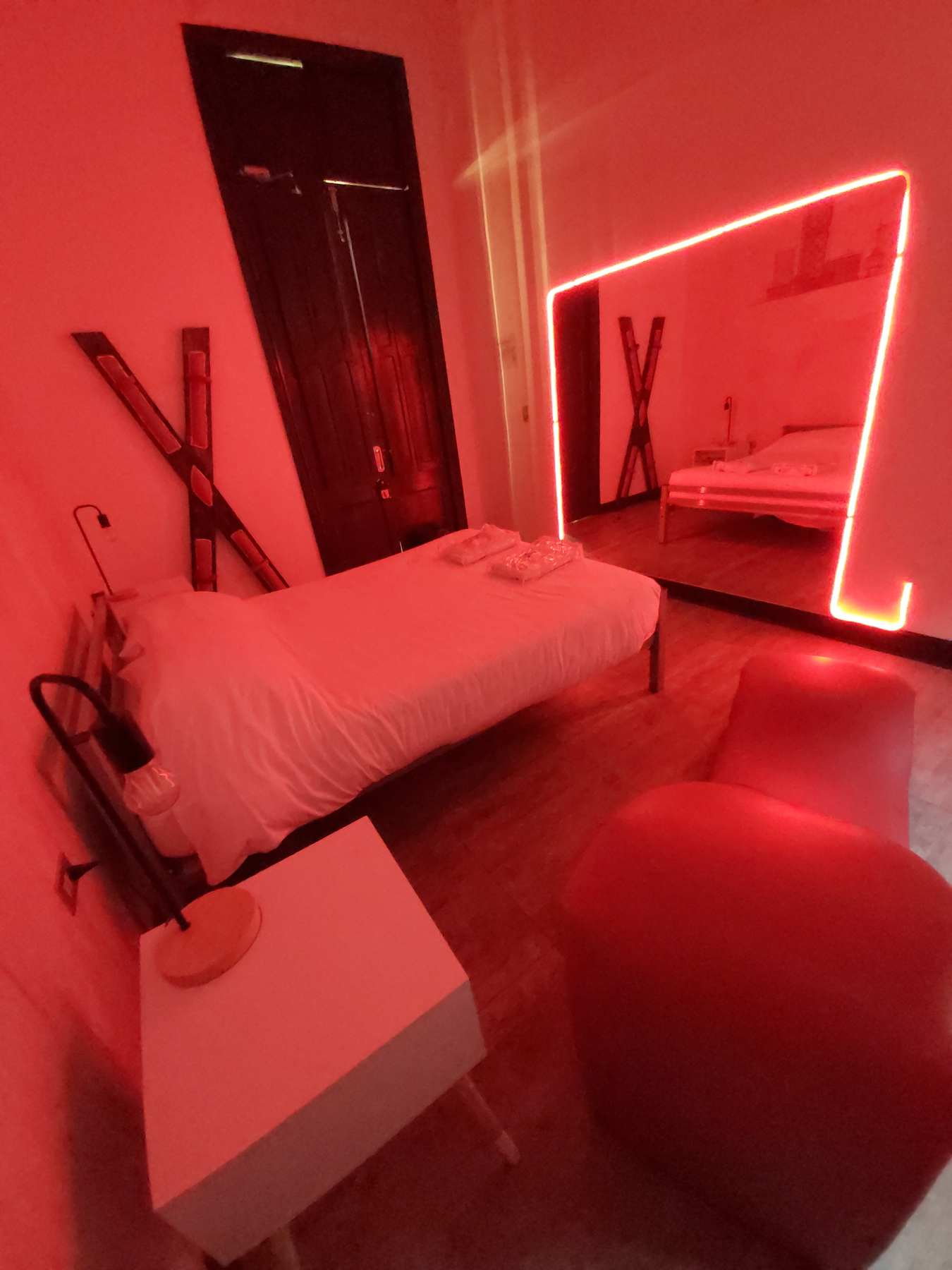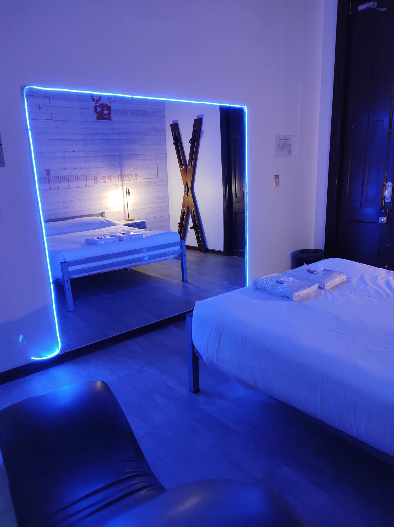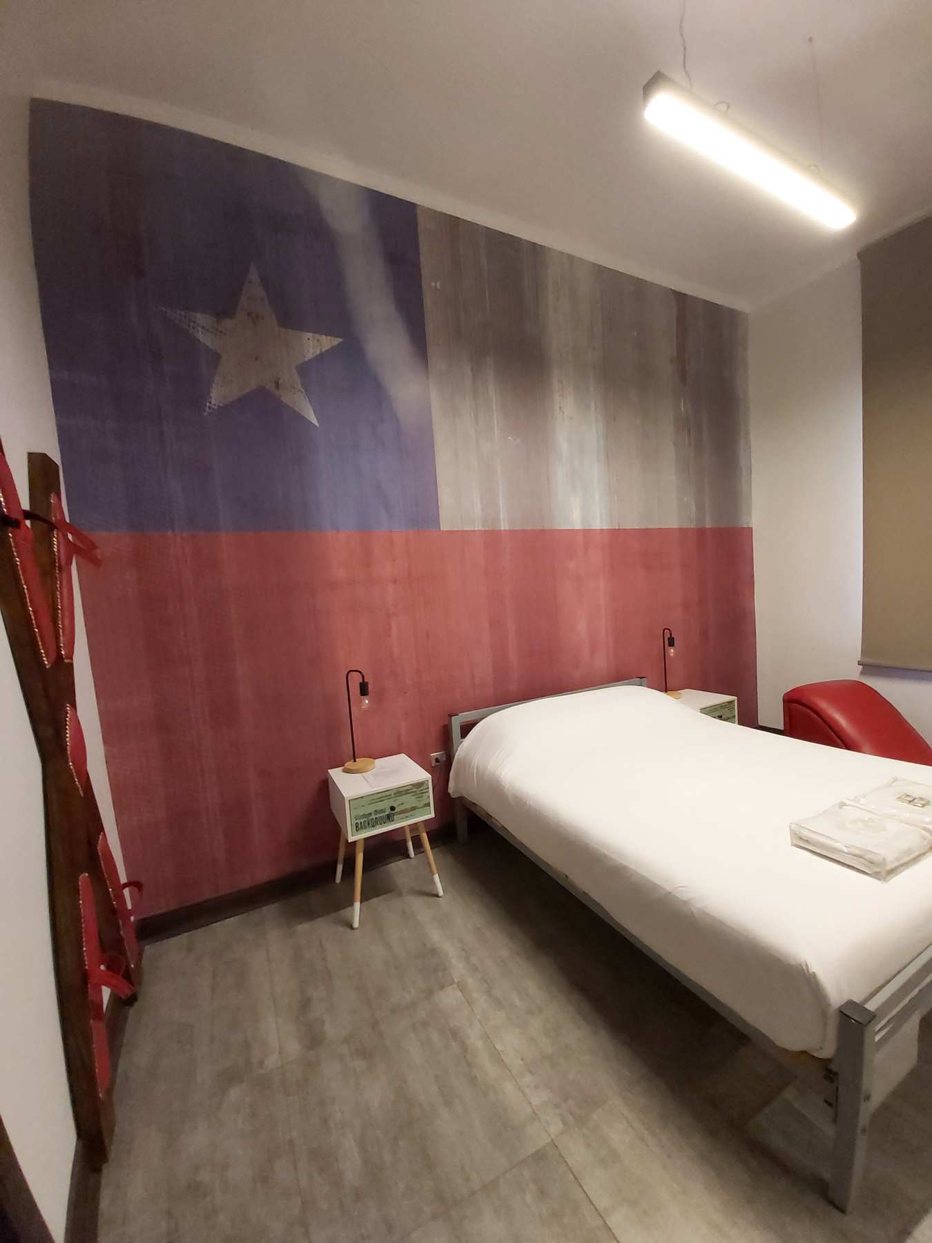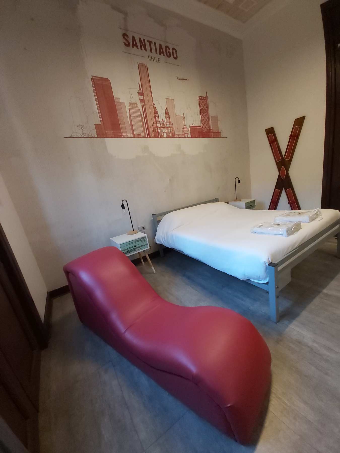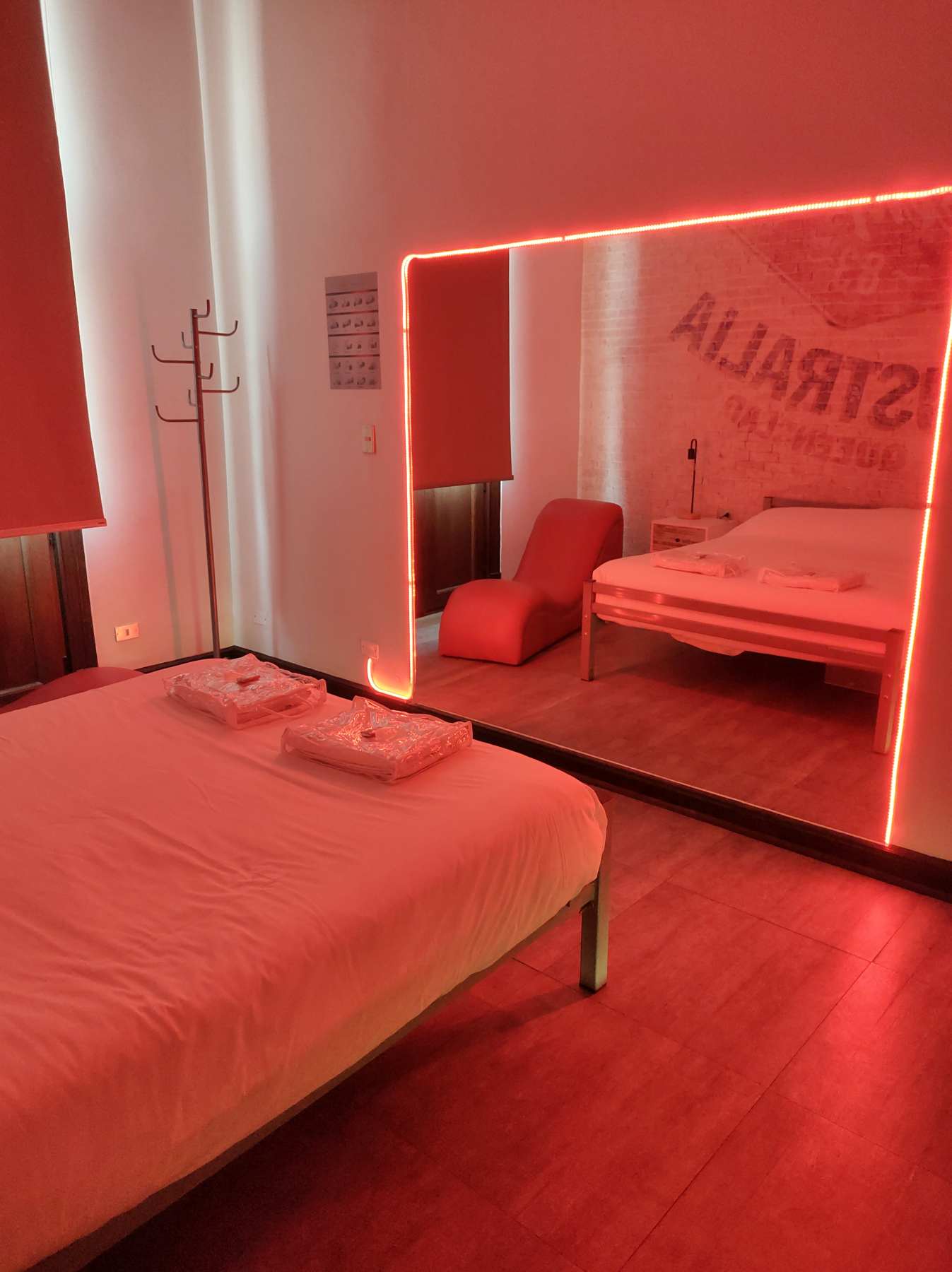 Nuestras habitaciones con baño privado exterior han sido creadas para brindarte una alternativa más económica para tu bolsillo, puesto que el baño se encuentra fuera de la habitación (solo a un par de pasos). Si tu presupuesto es bajo, no te preocupes y elige una de estas, te quedara más platita para los traguitos, comida o lo que quieras. Que no te preocupe ser visto camino al baño que por protocolo nadie te vera, a menos que quieras exhibirte loquill@. De igual forma podrás ejecutar el delicioso como se te ocurra, y si no se te ocurre o crees que ya se te ocurrió todo, te proporcionamos una gráfica con más de 20 posiciones que pueden abrir tu mente aún más. Podrás jugar con la diversidad de luces que posee, amarrarte o ser amarrado a la X del amor y dar rienda suelta a todas tus fantasías con tu música preferida gracias a la ampolleta – parlante soundbar. Además, con los grandes espejos podrás también disfrutar tu performance y perfeccionarla, a menos que ya sea perfecta campeón/a.